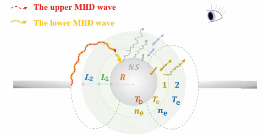 在中子星表面,向外辐射的种子光子与高温等离子体发生相互作用,产生了逆康普顿散射。从吸积盘磁层半径处产生的千赫兹的双磁流体动力学波(MHD waves)沿着磁力线传播到中子星的南、北两极,接着加热了包围中子星的均匀的冕。由于朗道衰减等物理机制的存在,MHD waves在等离子体中传输的距离是不一样的,从而其加热冕的区域是不一样的,最后引起了冕及其局部区域的物理量的振动,导致辐射出的X射线出现了准周期振荡的物理现象。该论文通过Kompaneets方程的扰动对该物理过程从理论上进行了详细的探讨,通过MCMC的方法对x射线双星的物理参数进行了计算。准周期振荡的物理起源取得的进展,对相对论物理、等离子体物理、吸积物理和辐射机制起着一定的推动作用。