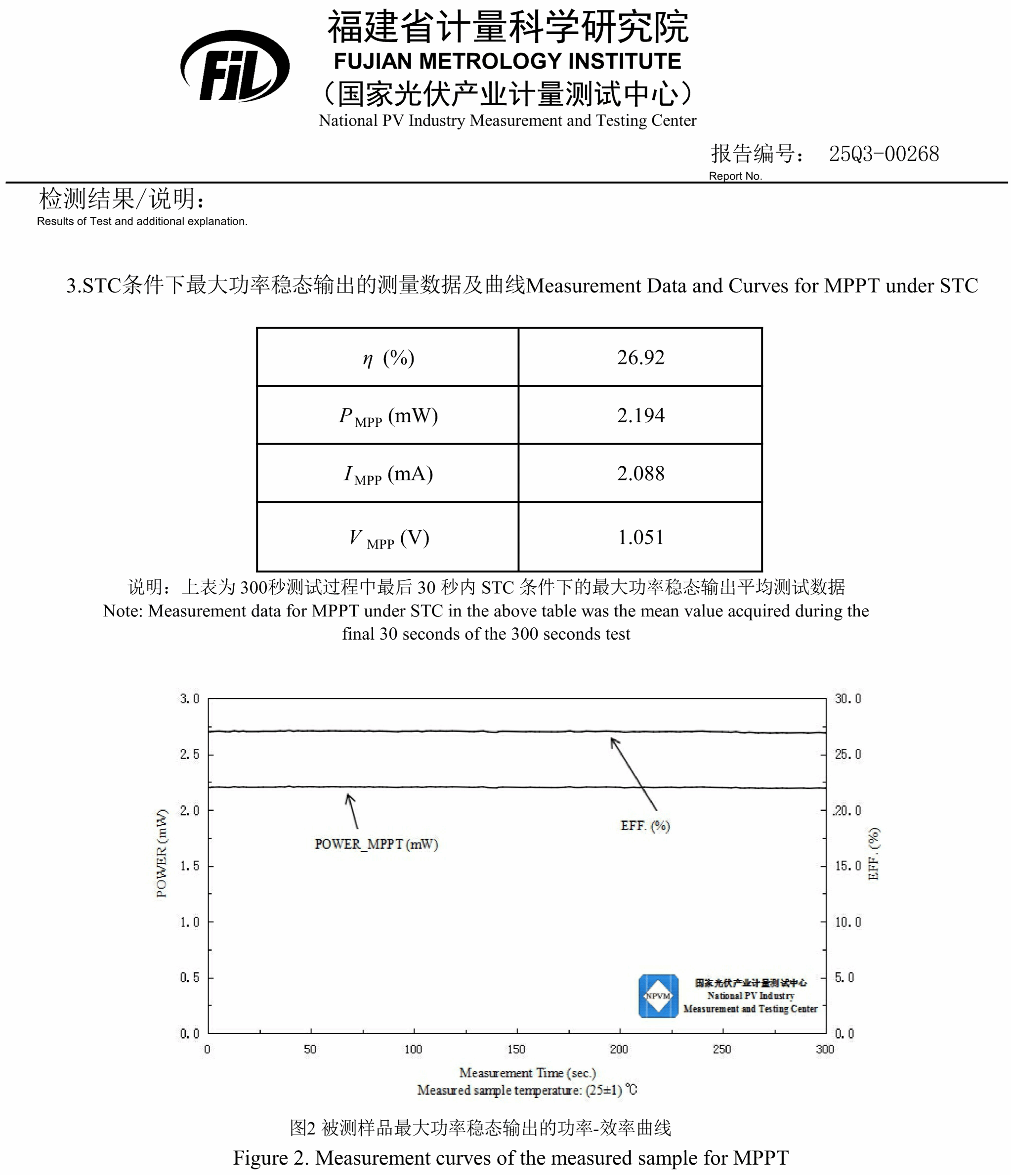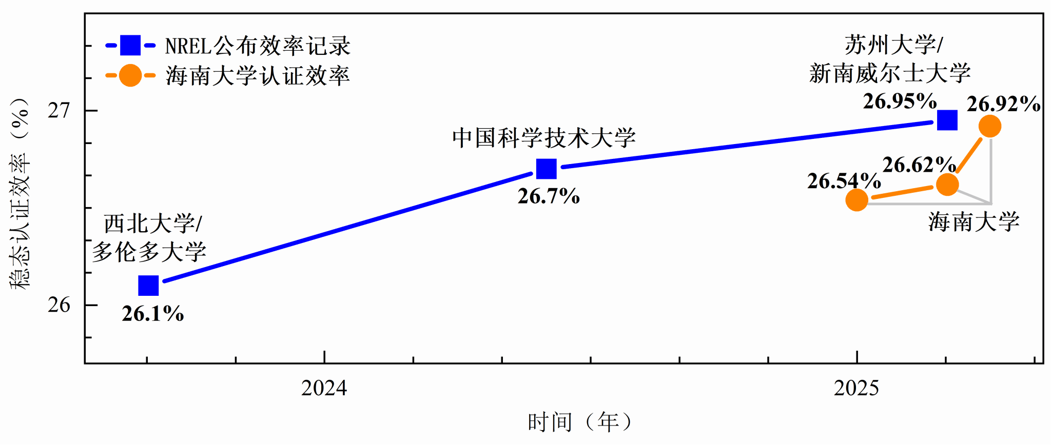 中国·yL23411永利新能源光电材料与器件团队在新型光伏器件研发中取得阶段性进展。该团队自主研发的钙钛矿太阳能电池经国际权威的中国国家光伏产业计量测试中心验证,稳态认证效率由2024年12月的26.54%迅速提升至2025年3月的26.92%,直追美国国家可再生能源实验室(NREL)最新公布的单结钙钛矿太阳能电池世界最高效率纪录(26.95%)。钙钛矿太阳能电池认证效率是国际公认的核心技术指标,由权威机构在标准测试条件下验证,其微小提升往往意味着材料设计、器件工艺等底层技术的实质性突破,因而成为全球钙钛矿研发团队竞逐的重要指标。该进展标志着yl23411集团新能源光电材料与器件团队在钙钛矿光伏器件制备技术水平上跻身国际先进行列。