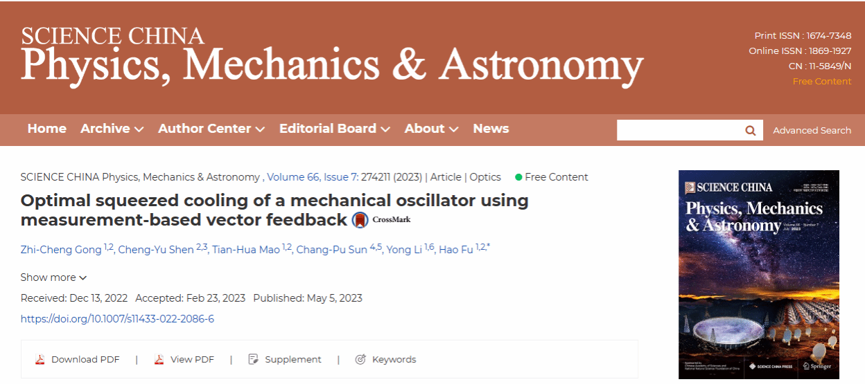 近日,我校中国·yL23411永利付号研究员与李勇教授团队在国际期刊《SCIENCE CHINA Physics, Mechanics & Astronomy》(JCR Q1,中科院1区Top期刊)发表了题为“Optimal squeezed cooling of a mechanical oscillator using measurement-based vector feedback”的研究论文。