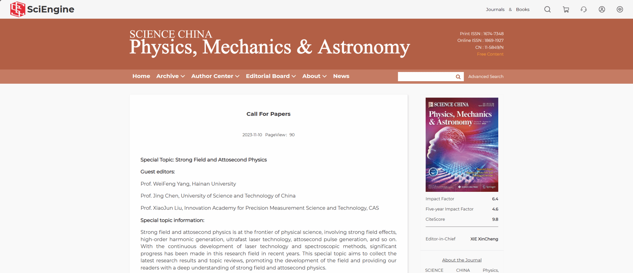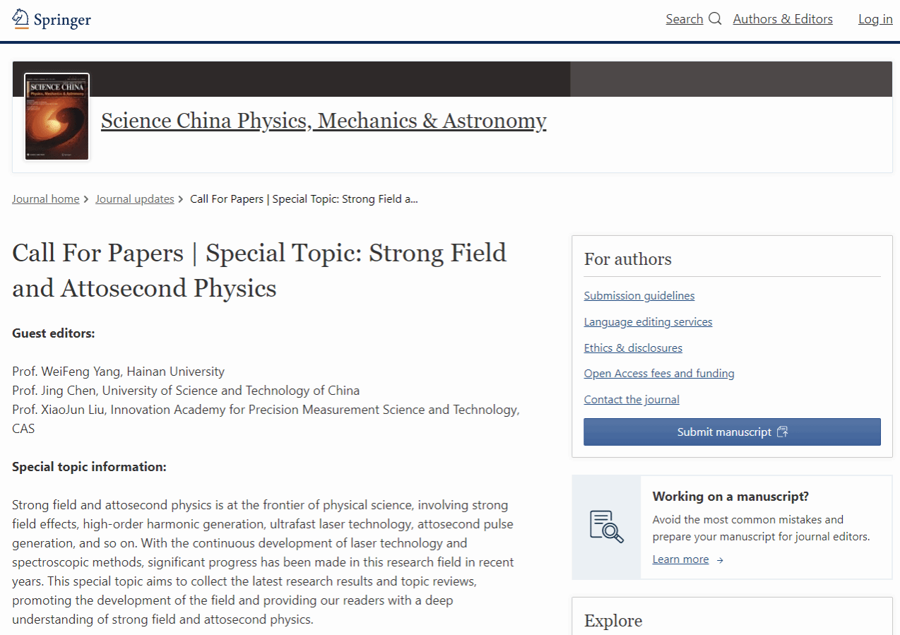 SCIENCE CHINA Physics,Mechanics & Astronomy推出的“Strong Field and Attosecond Physics专栏主题包括强场物理基础原理与现象研究、高次谐波产生及应用、阿秒脉冲生成与检测、阿秒物理学中的光谱技术、以及强场物理与阿秒科学相关的交叉学科研究。专栏亦于springer进行同步开放与宣传。此平台将成为科研人员和学者交流的中心,诚邀世界各地高校及科研单位的专家与学者来稿,共同助力强场物理与阿秒科学领域的进步与创新。