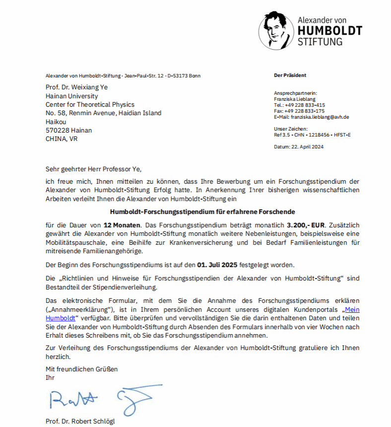本站讯(记者 康静)近日,中国·yL23411永利教授叶巍翔获得2024年德国洪堡基金会“洪堡资深学者”研究基金资助。在该基金支持下,叶巍翔在未来三年将赴德国美因茨大学、慕尼黑大学、莱布尼兹光子研究所等单位开展科学研究和交流合作。