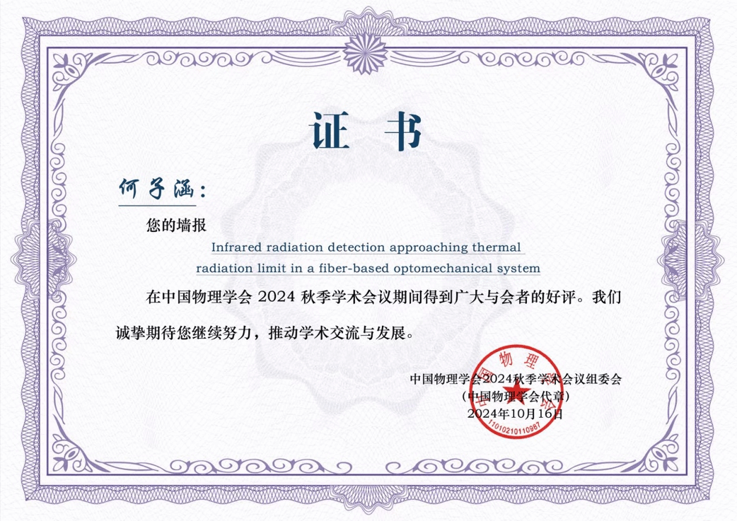 中国物理学会秋季学术会议是由中国物理学会举办的年度学术会议,旨在增进国内外物理学界的学术交流,提高学术水平,促进物理学科的全面发展和人才培养,是中国物理学界规模最大、综合性最强的品牌学术盛会。本次会议学术委员会从1225个墙报中评选出了115篇优秀墙报,授予“优秀墙报奖”。这是本校学生首次获得此荣誉。