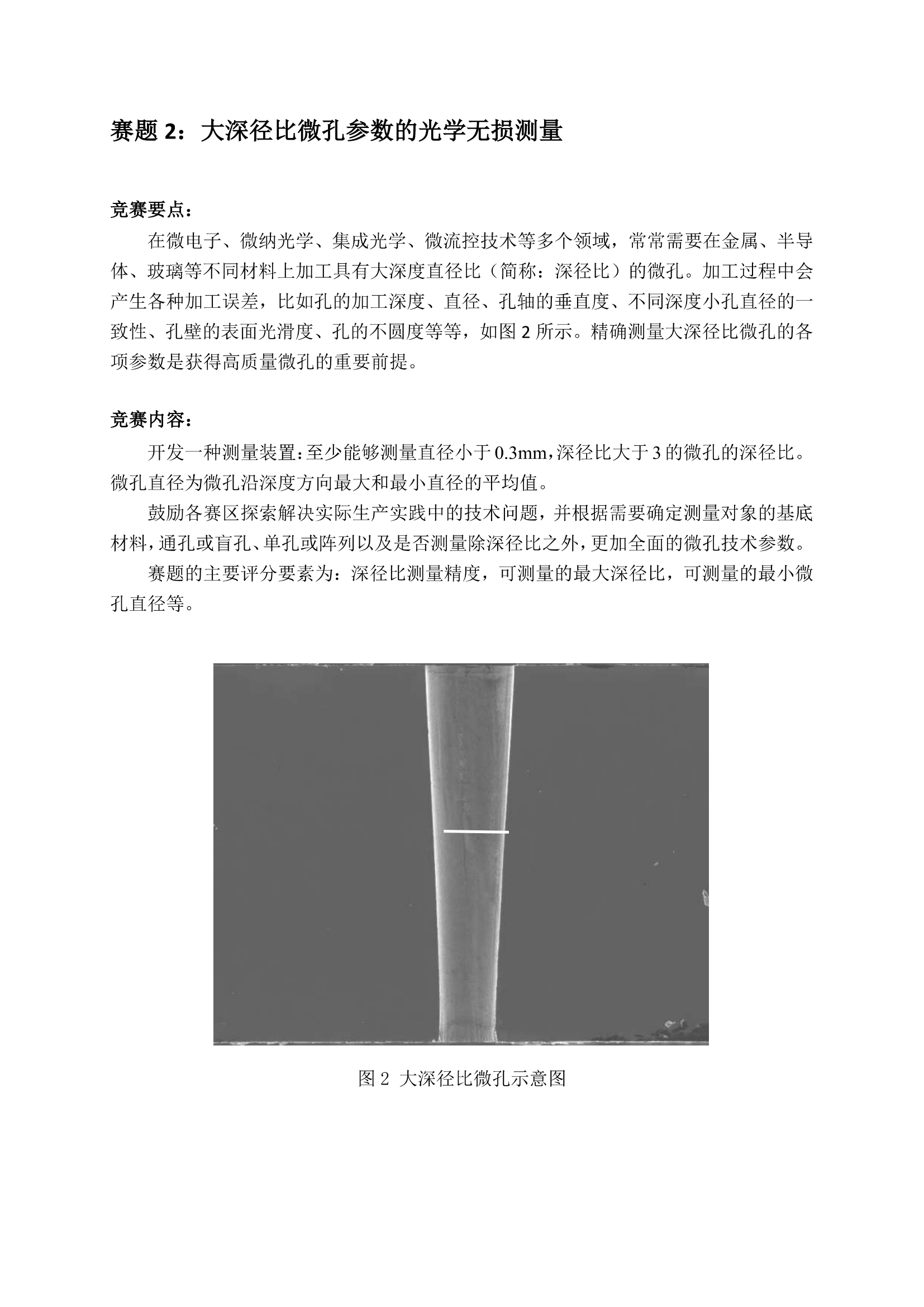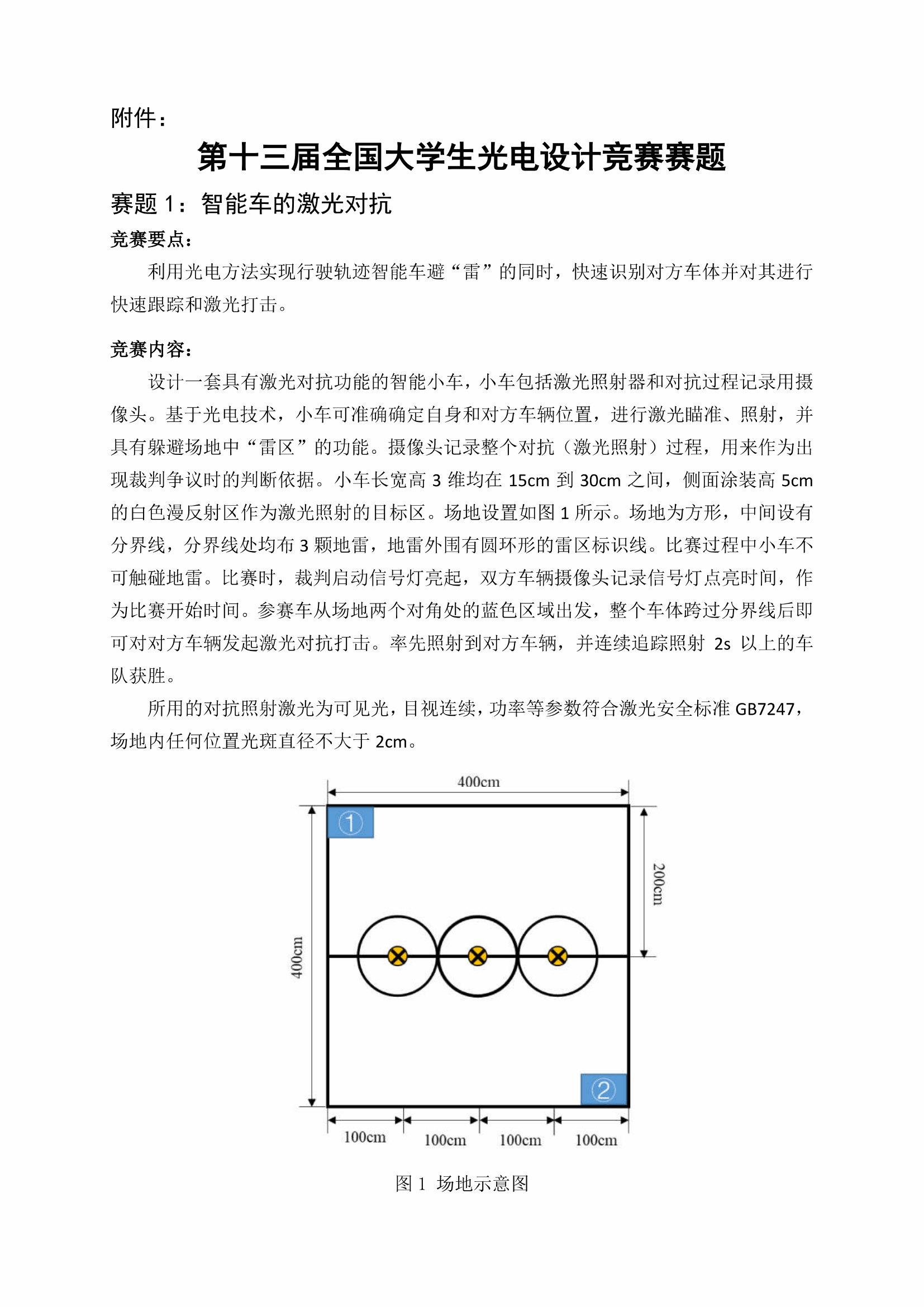 本届竞赛包含实物竞赛主赛道和光学设计赛道,将成立第十三届全国大学生光电设计竞赛组织委员会(含光学设计赛道分委员会),确保竞赛的组织实施工作有序开展。实物竞赛主赛道的赛题详见光电竞赛委(2024)7号《关于公布第十三届全国大学生光电设计竞赛赛题和优秀应征赛题奖的通知》,赛题1为智能车的激光对抗;赛题2为大深径比微孔参数的光学无损测量,详见附件1。光学设计赛道的赛题由第十三届全国大学生光电设计竞赛光学设计赛道分委员会秘书处另行通知。竞赛相关通知由全国大学生光电设计竞赛官方网站(http://gd.moocollege.com/)统一发布。