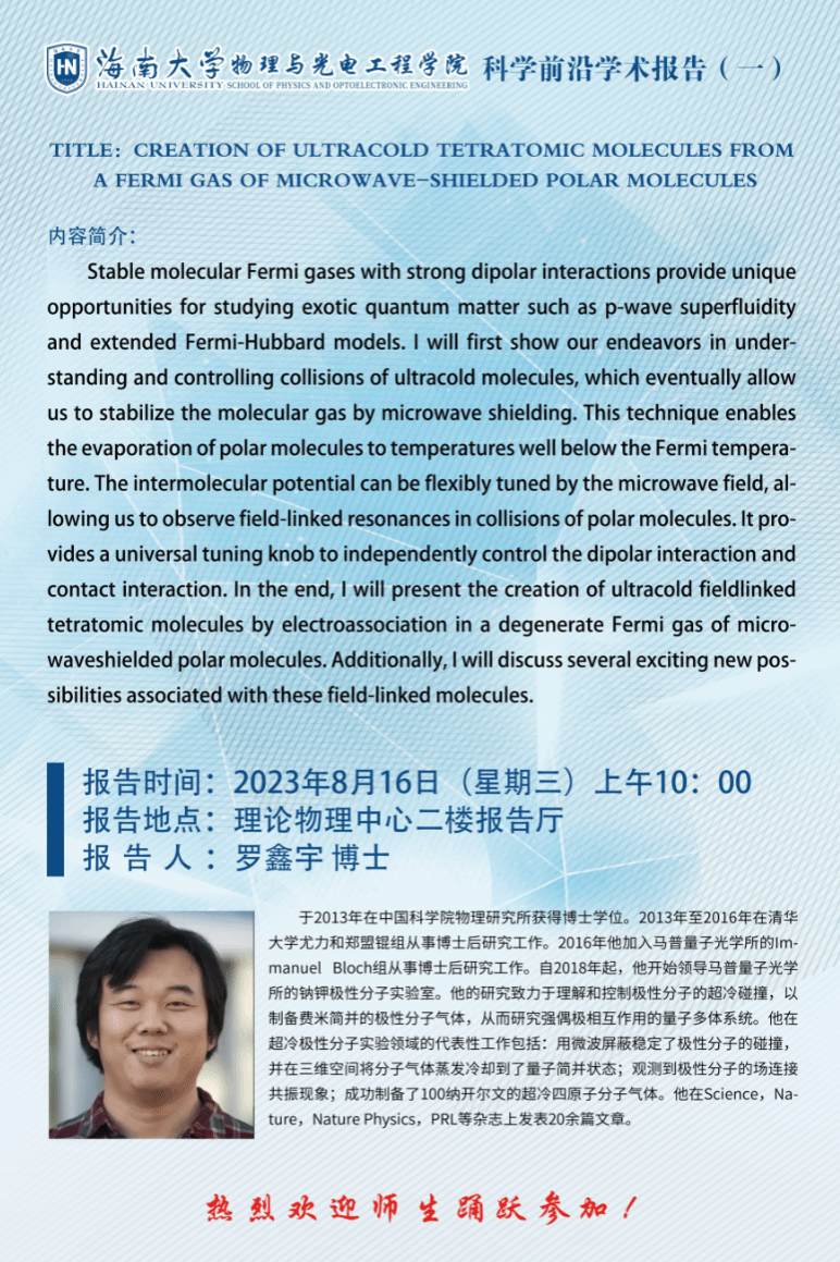 科学前沿学术报告(一):TIFLE:CREATION OF ULTRACOLD TETRATOMIC MOLECULES FROM A FERMI GAS OF MICROWAVE-SHIELLED POLAR MOLECULES
