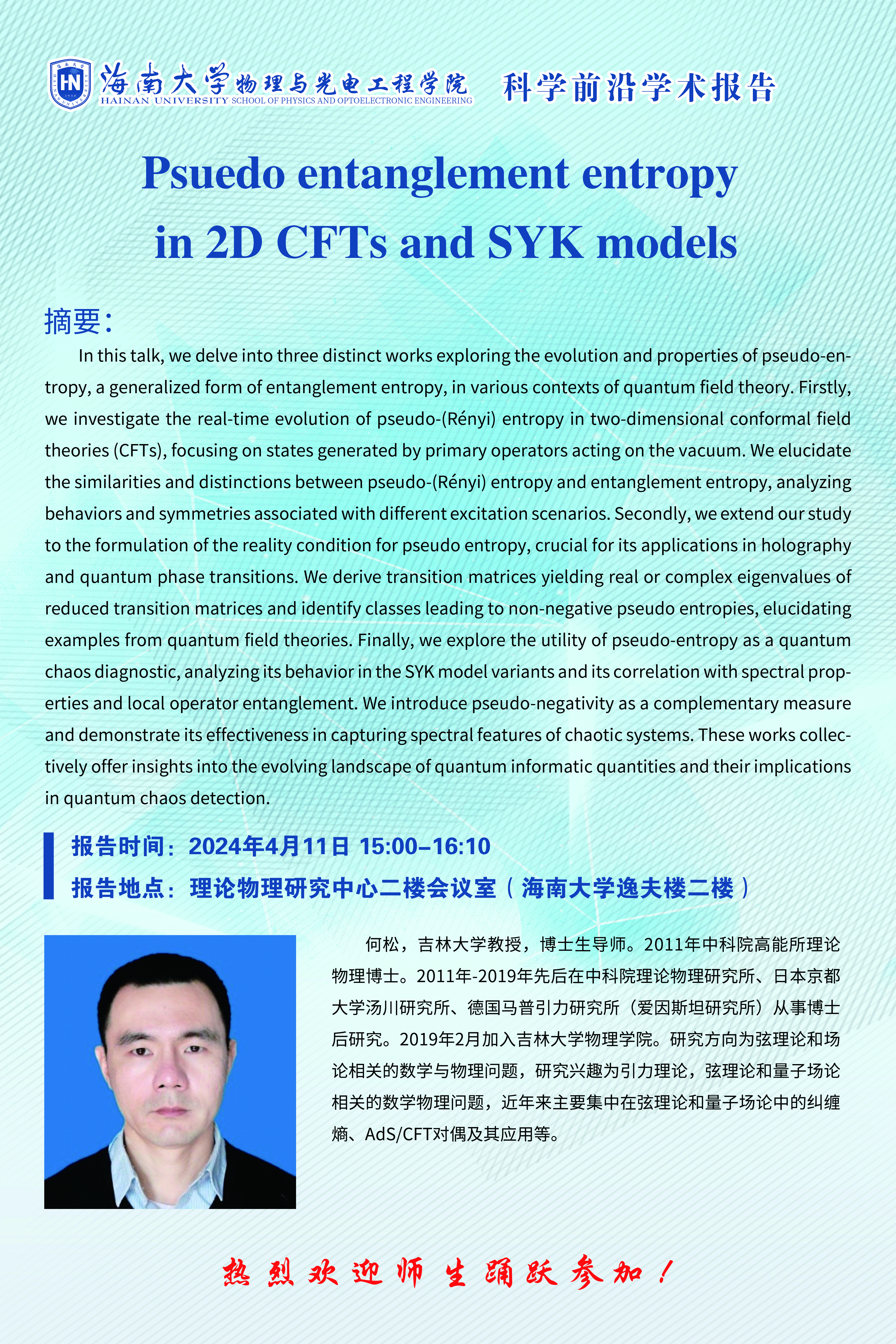科学前沿学术报告(二十二):Psuedo entanglement entropy in 2D CFTs and SYK models