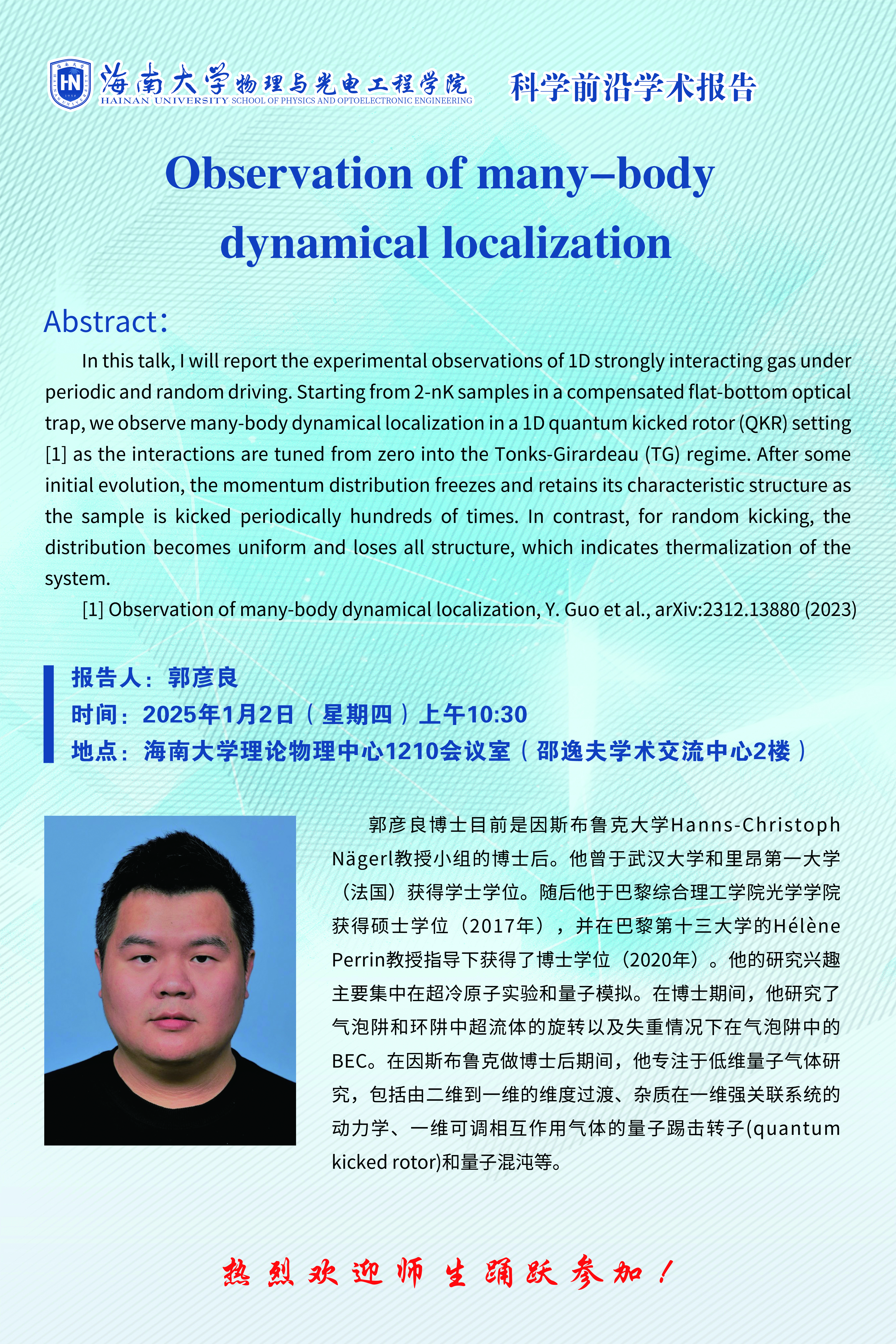 科学前沿学术报告(四十):Observation of many-body dynamical localization