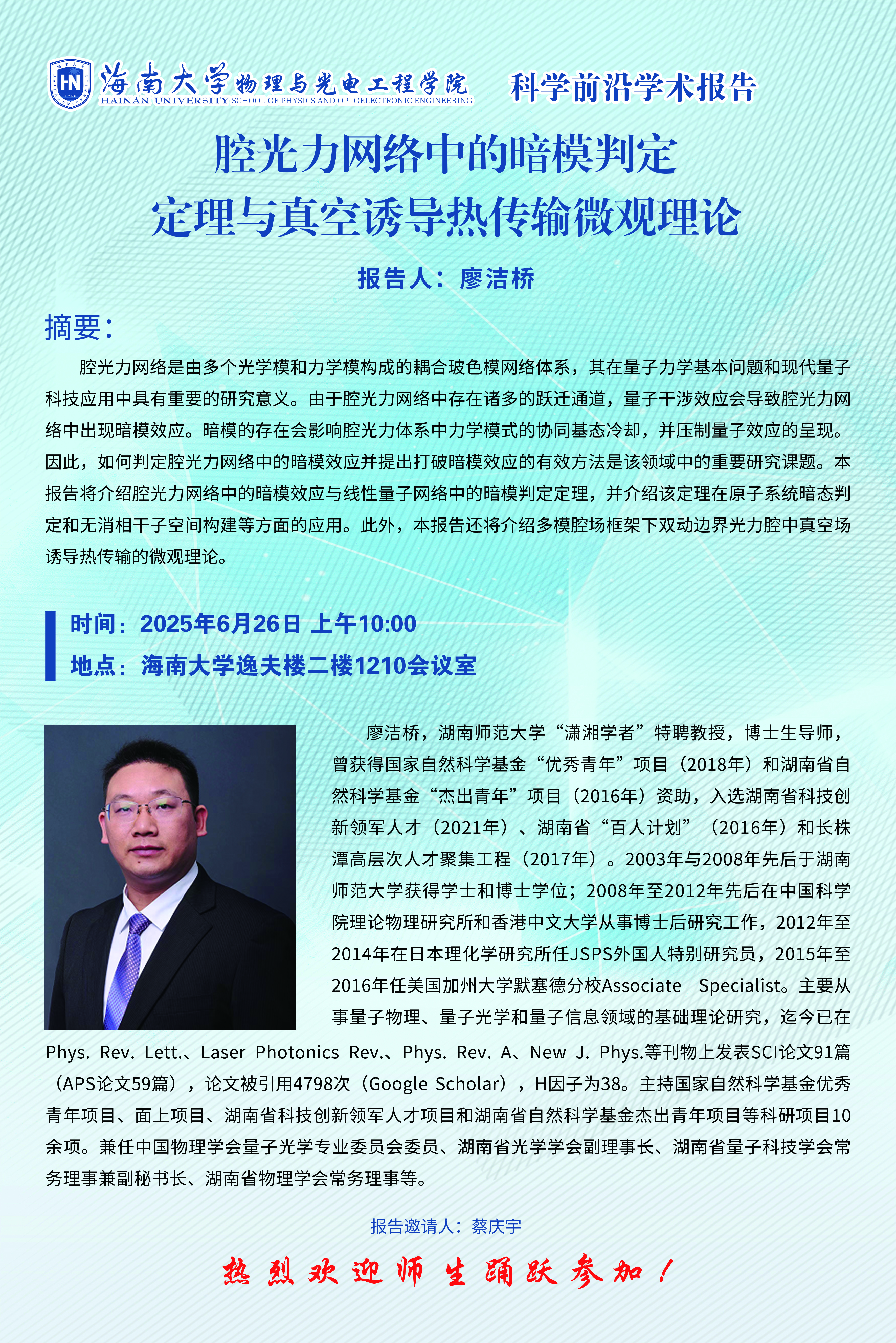 科学前沿学术报告(五十八):腔光力网络中的暗模判定定理与真空诱导热传输微观理论