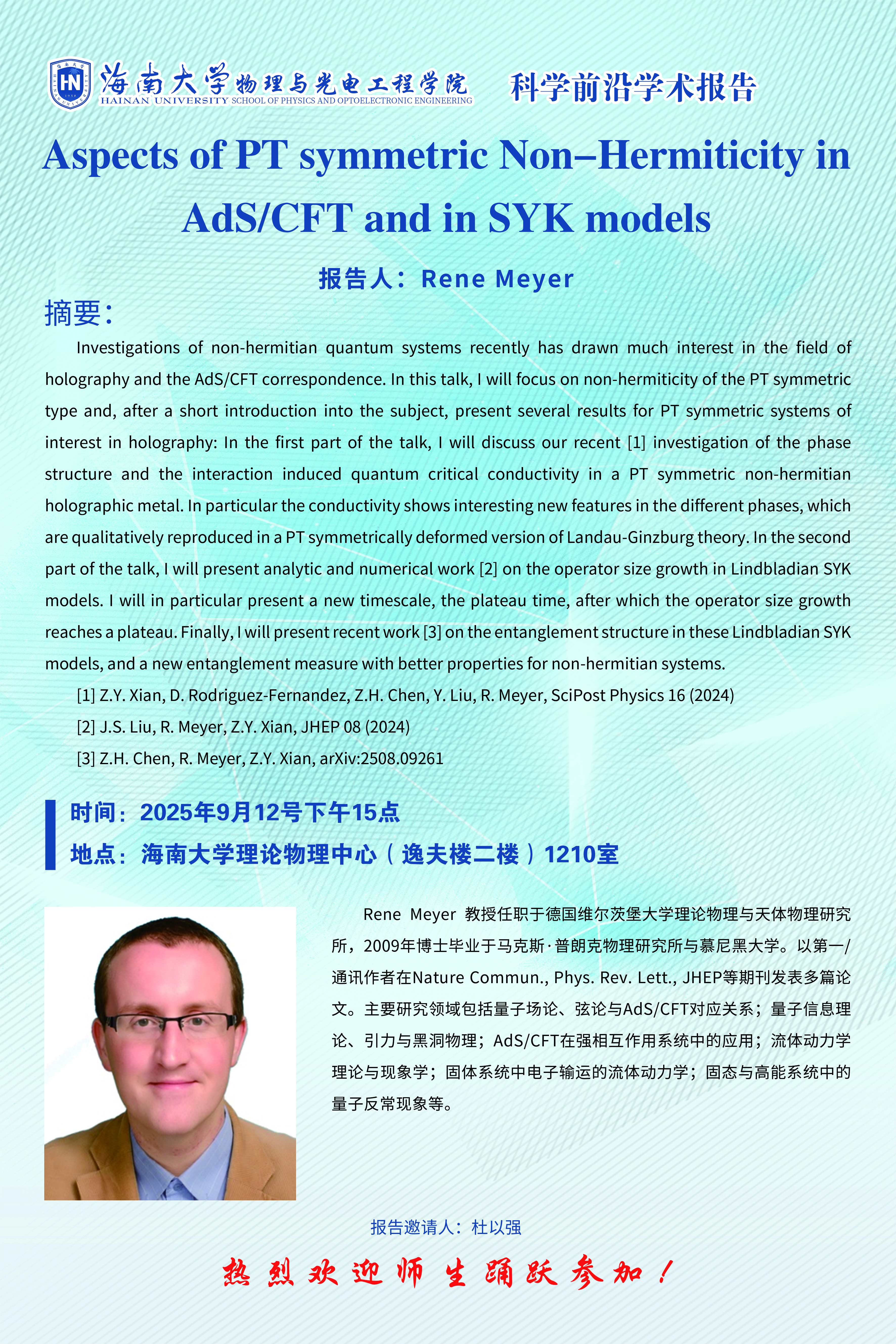 科学前沿学术报告(六十二):Aspects of PT symmetric Non-Hermiticity in AdS/CFT and in SYK models